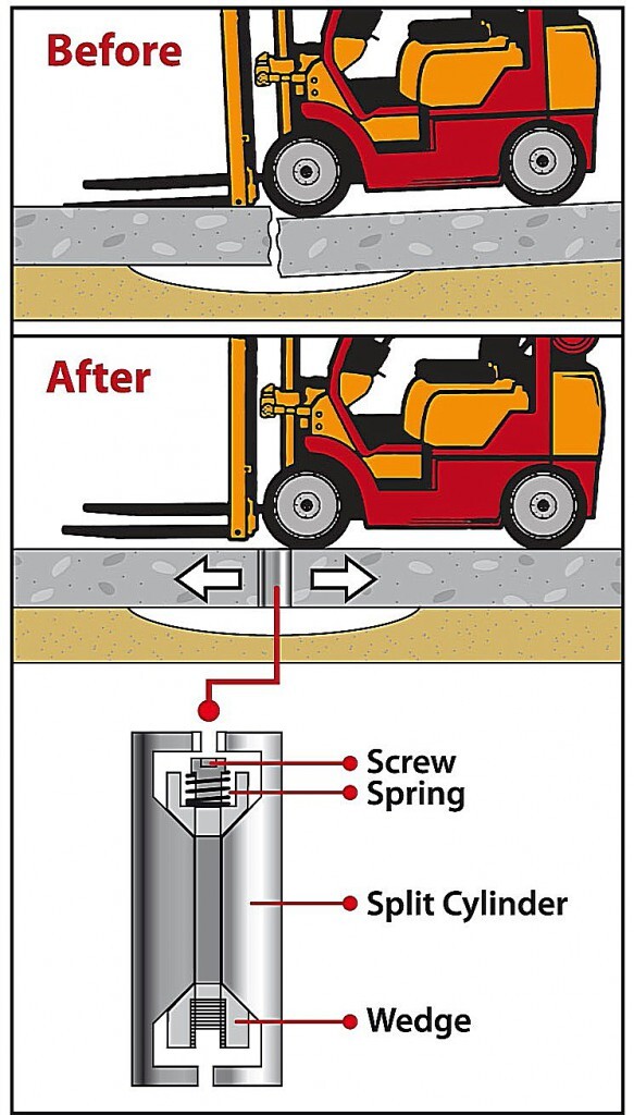Установленный стабилизатор предотвращает перемещение краев плит пола относительно друг друга. При движении погрузчиков такие «зафиксированные» плиты работают как одна плита, практически полностью устраняя причины появления разрушений в районе деформационных или усадочных швов.